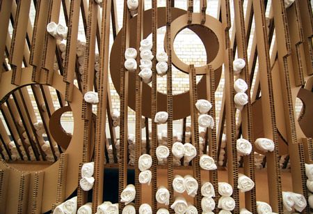 Although underground plants are not uncommon in the city of London, they are usually the type with ducts and boiler rooms rather than flowers and trees. Nevertheless, residing in the underpass forecourt of the V & A, is a cartouche-shaped topiary bejeweled with rose blossoms that tapers to a crown before sprouting an array of forked branches whose shadows fence across the grand vaulted ceiling. It is a curious beast – its trunk and twigs are constructed from honeycomb paper sandwich panels, its flowers from rolled recycled garments that change to reflect the seasons.
